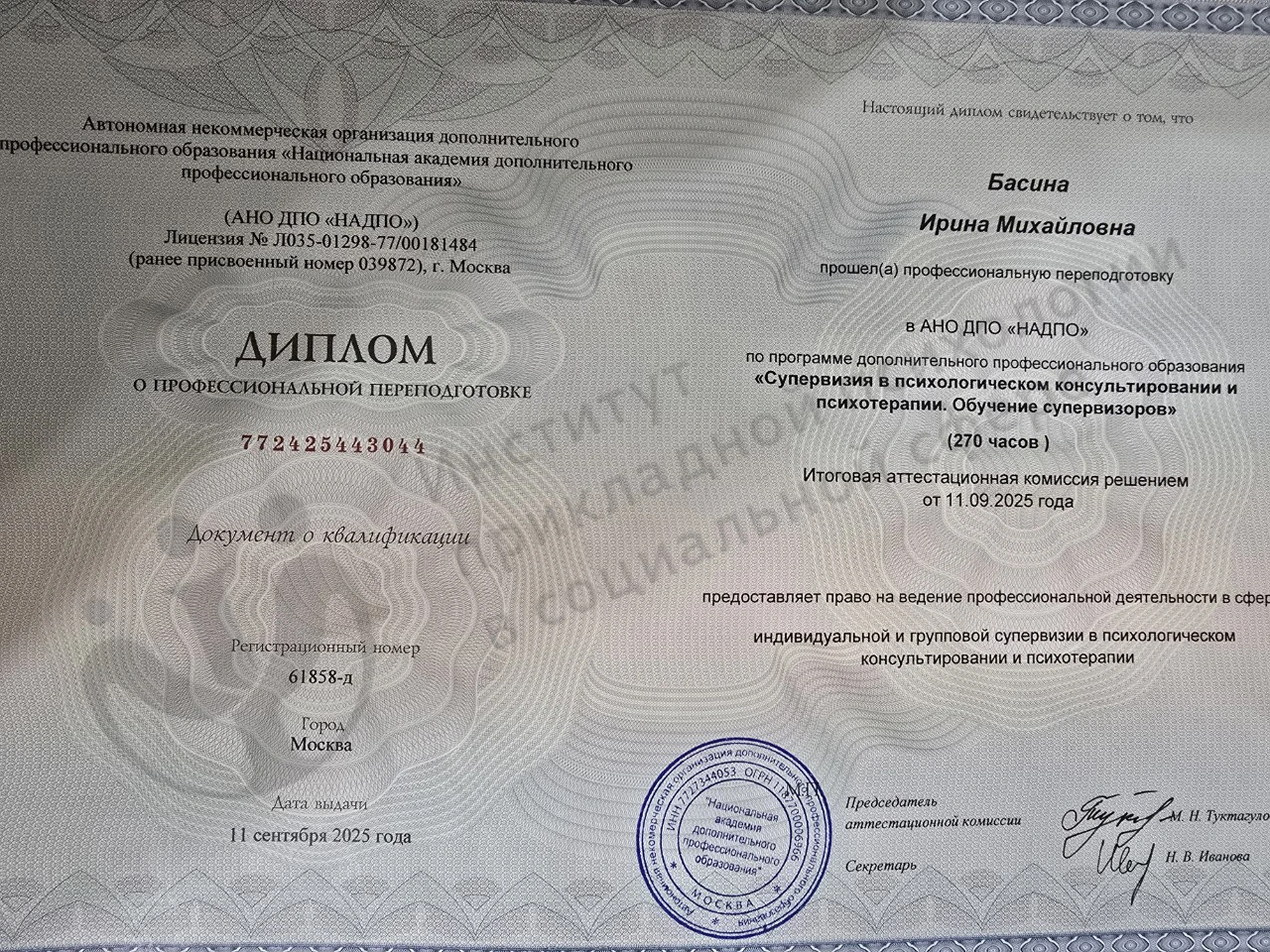 Супервизия в психологическом консультировании и психотерапии. Обучение супервизиоров, 11.09.2025, АНО ДПО «НАДПО»